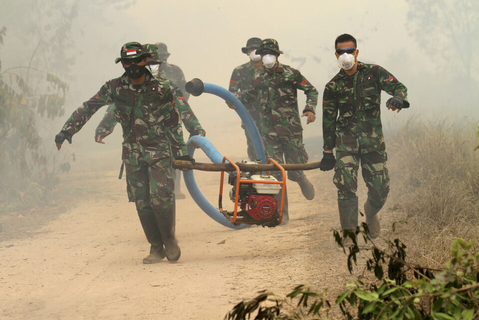 Indonesiske soldater bærer en vannpumpe i de brannherjede skogene på Sumarta i Indonesia. (Foto: Antara foto, Reuters)