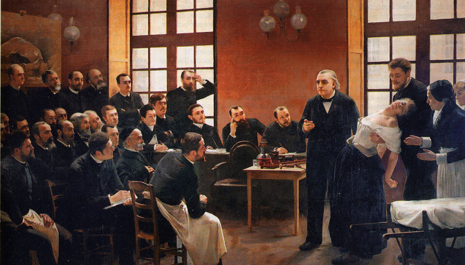 André Brouillets kjente maleri fra 1887 avbilder en medisinsk forelesning om kvinnelig hysteri, en utbredt diagnose på 1800-tallet. I ekstreme tilfeller kunne kvinnen risikere å bli plassert på galehus eller få fjernet livmoren sin. (Maleri: Pierre-André Brouillet/tilgjengeliggjort av Wikimedia.)