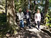 Lina Ellingsen-Dalskau (til høyre) er en av forskere som har observert aktiviteter på gårder som tilbyr demensomsorg. Her på tur med brukere på Stene gård. (Foto: Tove Rømo Grande / NMBU)