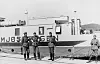 Dette bildet er tatt 3. august 1940. På bildet står fire tyske soldater på Gjøvik brygge. Mjøsfærgen I ble senere brukt til å dumpe granater i Mjøsa.(Foto: Ewald Schumann / Mjøsmuseet)