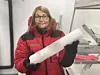 Forsker Elisabeth Isaksson har vært involvert i jakten på verdens eldste is helt tilbake til prosjektets forberedelser i 2016. Denne iskjernen en prøve fra fryselageret ved Framsenteret i Tromsø.(Foto: Elin Vinje Jenssen / Norsk Polarinstitutt)
