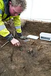 Vitenskapelig assistent Ole Alexander Dyrli Husby graver frem et sverd. (Foto: Astrid Lorentzen / NTNU Vitenskapsmuseet)
