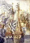 Klikk på dette utsnittet for å se hele tegningen av Slaget ved Femern i 1644. Tegningen ble bestilt av den svenske admiralen Karl Gustav Wrangel for å minnes seieren. Skipet til høyre er det nederlandske Groote Dolphijn, mens skipet til venstre er To løver.(Tegning av Willem Van De Velde / Cutout og info via Niklas Erikson)