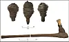 Noen av funnene fra Must Farm. Det øverste er hyssing eller garn som er tvunnet rundt en trepinne, og nederst ser du en øks. (Bilde :D. Webb/Knight et al./Antiquity)