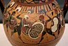 En vase fra rundt 560 f. Kr. som viser soldater fra de greske bystatene, kalt hoplitter.(Bilde: Tyrrhenian Group, Fallow Deer Painter)