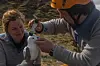 Sebstién Descamps (t.v.) og en student teller krykkjer ved fuglefjellet Alkhornet på Svalbard.(Foto: Ann Kristin Balto/Norsk Polarinstitutt)