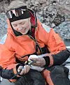 Etter å ha satt opp felle for sjøfuglen blir det alltid litt venting. Lovise Pedersen Skogeng slapper av i den arktiske sola.(Foto: Geir Wing Gabrielsen / Norsk Polarinstitutt)