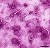 To ulike vesiklar, ein med enkel membran (kvit pil) og ein med dobbel (svart pil).(Foto: Petter Langlete)