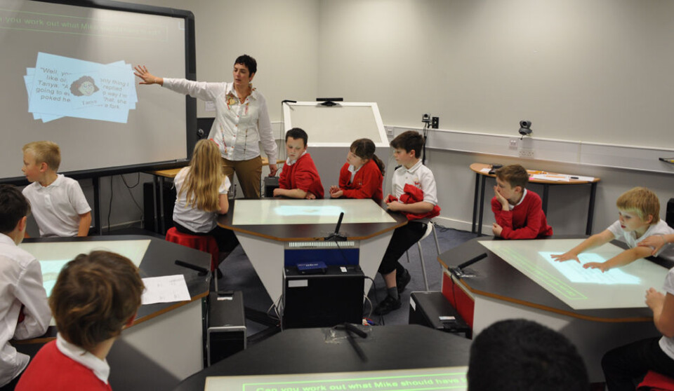 SynergyNet-pultene kan kobles sammen, og til klassens digitale Smartboard-tavle. Læreren kan følge med på pultene, sende oppgaver til dem og flytte svar mellom pultene og til tavla. (Foto: University of Durham)