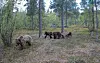 Hunnbjørnen FI220 med tre fjorårsunger (FI352, FI353 og FI360) undersøker hårfellen i Karasjok.(Foto: Jan Helmer Olsen / NIBIO viltkamera)