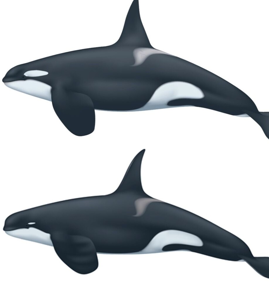 Her ser du vanlig spekkhogger øverst og Type D nederst. Type D har buttere snute, mindre flekk ved øyet og en smalere og spissere ryggfinne. (Illustrasjon: Uko Gorter)