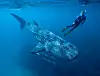 En av forskerne bak studien, Mark Meekan, dykker med en hvalhai.(Foto: Wayne Osborn)