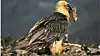 Hun vasset ut i vannet, tok teinen i munnen og dro den lenger inn. Deretter rev hun opp nettingen og fisket ut den oransje koppen med åte i.