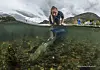 Tekniker Sofie Knutar frå Havforskingsinstituttet slipper ut laks i Etne.(Foto: Audun Rikardsen / UiT)