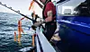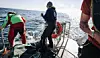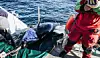 – Det gjelder å komme raskt over fisken med båten, sier Keno Ferter, som må hale fisken opp for hånd de siste meterne. Hanskene er laget av kevlar. I bakgrunnen: Martin Wiech.(Foto: Erlend Astad Lorentzen / HI)