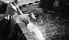 Under merkingen i 1957 ble størja fanget med not, og måtte trenges sammen.