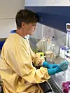 Forskerne laget en modell i en petriskål med celler som skulle simulere veggen mellom lungene og blodbanen. Her er Bendik Brinchmann på labben. [Foto: Privat]