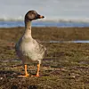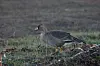 TUNDRAGÅS (Anser albifrons). Hekker nærmest oss på Island og i Nord-Russland. Overvintrer hovedsakelig i Storbritannia og Nederland. Hovedtrekket passerer ikke Norge, men en del tundragjess sees likevel her i landet hvert år. Småflokker kan overvintre langs kysten av Sør-Norge. Dette er en ungfugl uten hvitt pannebliss. (Foto: Morten Günther)