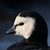 HVITKINNGÅS (Branta leucopsis). Vanlig hekkefugl på Svalbard (12-15 000 par). Svalbardbestanden overvintrer ved Solway Firth på grensen mellom Skottland og England. Spesielt under vårtrekket raster store flokker på Helgelandskysten og i Vesterålen. Et mindre antall hvitkinngås hekker også i Sørøst-Norge, spesielt i Oslofjord-området. (Foto. Morten Günther)