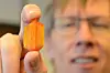 Prosjektleder Eirik Malinen med en prøve av materialet som er under uttesting. Kanskje kan det brukes til å sjekke stråledose ved fremtidens protonterapi.(Foto: Hilse Lynnebakken / UiO)