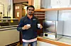 Postdoktor Ravikumar Nattudurai med to alanin-blandinger. Den oransje fargen kommer av innblanding med jern, mens den blå skyldes kobber.(Foto: Hilde Lynnebakken / UiO)
