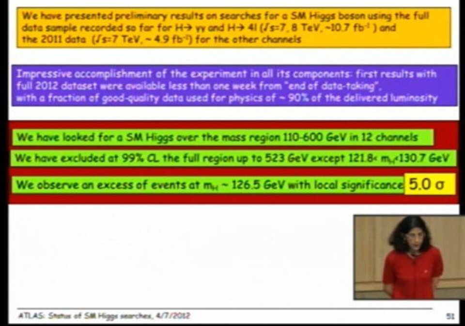 Fabioloa Gianotti presenterer funnet av Higgs ved Atlas-eksperimentet ved CERN. (Foto: (Skjermdump fra direktesendingen på CERN))