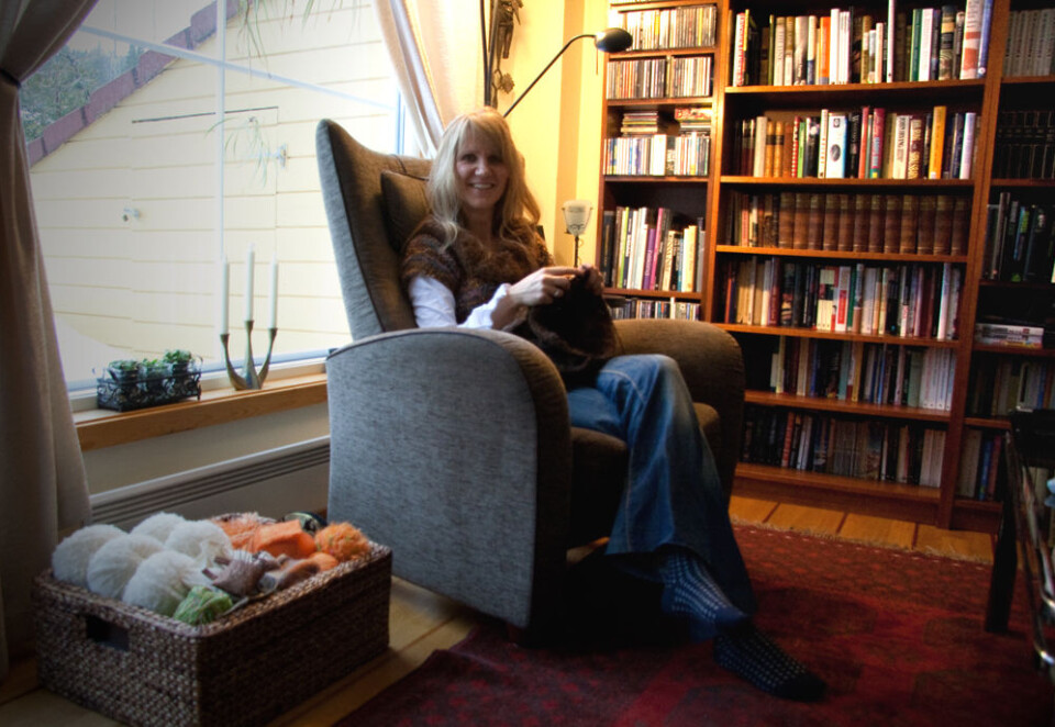 Merethe Frøylands store hobby er strikking, gjerne utført i godstolen. Hun er også ofte kledd i egne kreasjoner. (Foto: Ingrid Spilde)