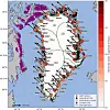Grafikken under viser hvordan landjorda i Grønland beveger seg horisontalt. Dette er målt av 58 GPS-stasjoner. Pilene viser hvilken vei bakken flytter seg. Fargen på høyre side viser hastigheten per år. Det store, hvite feltet er den digre innlandsisen, breen Grønlandsisen.