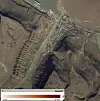 Kartet viser målt bevegelse i bakken ved Gruve 1 i Longyeardalen på Svalbard. I 2018 ble det registrert opptil 12 centimeter bevegelse. Bevegelsen kan sees som en mørk rød flekk til venstre i bildet og kan true kulturminnet.(Foto: NGU)