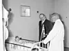 Den nykronede Kong Olav V besøker Rikshospitalets barneklinikk i 1958. Klinikken ble åpnet av Kronprinsesse Märtha i mai 1950.Ukjent fotograf, Universitetets fototekniske avdeling, Rikshospitalet.