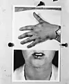 To bilder avfotografert sammen til undervisning i 1939. Pasient med herpes simplex hudinfeksjon på leppene og erythema multiforme forårsaket av infeksjonen på hendene. Erythema multiforme etter herpesvirusinfeksjon gir ofte disse karakteristiske "bulls eye"-utslettene.Foto: Sæther, Røntgen-Radiuminstituttet, Rikshospitalet.