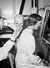 Leger med en pasient på Hudavdelingen, 1951. Stolen pasienten sitter på finnes fortsatt på Rikshospitalet i dag.(Ukjent fotograf, Universitetets fototekniske avdeling, Rikshospitalet)