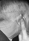 Hudkreft bak høyre øre. Muligens et plateepitelkarsinom, men det er ingen annen informasjon knyttet til bildet, som er fra 1938. Tatt på et 4x5 tommer stort glassnegativ med et storformatskamera.Foto: Sæther, Røntgen-Radiuminstituttet, Rikshospitalet.
