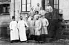 Da dette bildet ble tatt i 1895, var alle diakonstudenter fremdeles menn. Studentene har korte frakker. Til venstre for dem står reservelegen og overdiakonen.(Foto: Misjons- og diakoniarkivet)