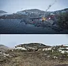 Utgravingane på Hjartøyna har avdekt fleire båtopptrekk frå vikingtida. Øvst: Slik kan eit av dei ha sett ut rundt 870, heilt i starten av landnåmstida. Nedst: Den same vika i 2022. (Foto: Ragnar Løken Børsheim / Universitetsmuseet i Bergen)