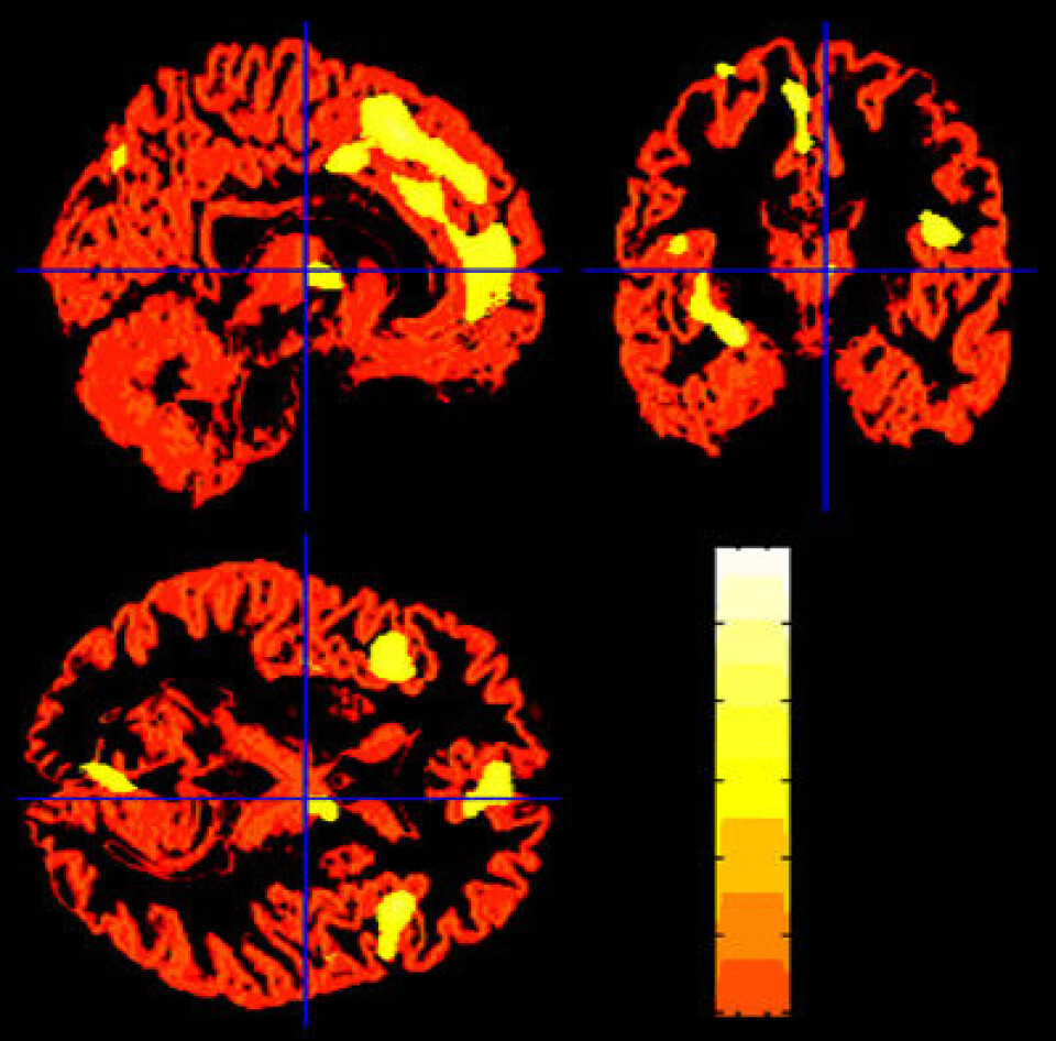 "Hjerneområder som har mindre volum av grå materie, blant de som var i nærheten av terrorangrepet. Alle områdene, som er lyse i fargen på dette bildet, henger sammen med behandling av følelser. (Foto: Barbara Ganzel/Cornell University)"