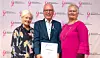 Generalsekretær i Kreftforeningen, Anne Lise Ryel (t.v.) og styreleder i Brystkreftforeningen, Ellen Harris Utne, delte ut 4,7 millioner til professor Terje Alræk ved Høyskolen Kristiania. (Foto: Kreftforeningen)