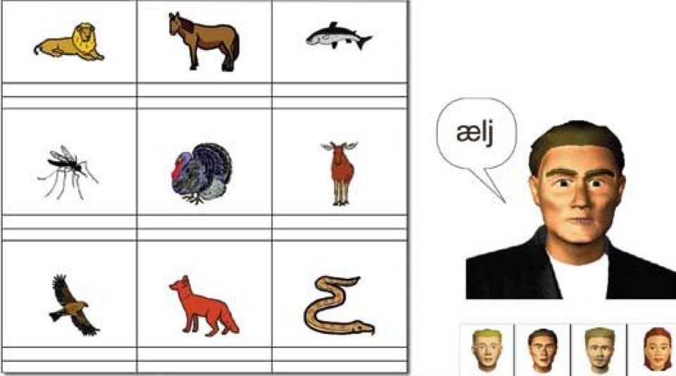 Dyr er ein av dei mange kategoriane i språkprogrammet. Når du klikkar på biletet, får du høre korleis ordet vert uttalt på norsk. Du kan velje mellom åtte forskjellige lærarar med ulike dialektar. (Foto: (Illustrasjon: Calst))