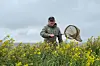 Anders Endrestøl på jakt etter fremmedarter på søpledynga på Falklandsøyene, med fremmedarten bondekål Brassica rapa i forgrunn.(Foto: Kristine B. Westergaard / NTNU)