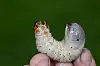 Eremittlarven er skittenhvit og spredt forsynt med korte, brune hår, og kan bli mer enn 6 cm lang. Hodekapselen er brun med et par mørke, kraftige kjever. Larven lever i og av vedmulda i tre-fire år. Her gjennomgår den en rekke larvestadier før den klekker som voksen bille. (Foto: Oddvar Hanssen / Anders Endrestøl / NINA)
