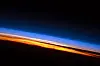 Solnedgang fotografert av en satellitt over Det indiske hav. Her ser du tydelig lagene i atmosfæren. Nederst i oransje og rødt er troposfæren. Over der ligger stratosfæren i rosa og hvitt. Over den forsvinner gradvis resten av atmosfæren (blå) ut i verdensrommet. Avstanden fra jordoverflaten til toppen av stratosfæren er i underkant av 1 prosent av jordas radius.(Foto: NASA)