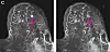 MR-bilde av et bryst med tett brystvev. Den rosa pilen viser en kreftsvulst. Bildet til høyre viser områder i brystet som den kunstige intelligensen har vurdert. Rød betyr høy sannsynlighet for kreft.(Foto: Radiological Society of North America)