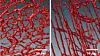 Blodårer i ein svulst (venstre) er meir kaotisk og meir lekk enn blodårer i normalt, friskt vev (til høgre). (Foto: Nina Kristine Reitan, NTNU)