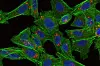 Biletet viser endotelceller som har ete nanopartiklar. Cellene er grøne, cellekjernene er blå, mens dei raude prikkane er nanopartiklar. Endotelceller utgjer ein viktig del av blod-hjerne-barrieren. (Foto: Habib Baghirov, Institutt for fysikk, NTNU)
