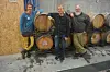 Forskere har funnet noen spesielle gjærtyper i prøver fra lufta, frukten og ølet på gården i Telemark. Her står ølbrygger Eivin Eilertsen, forsker Lars Axelsson ved Nofima og Andrew Jenkins, professor i mikrobiolog ved Universitetet i Sørøst-Norge, i kjelleren der tønner med surøl og sider blir lagret på fat.(Foto: Lars Axelsson, Nofima)