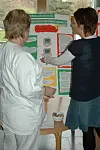 "Student Benthe Juklestad forteller om undersøkelsen til spesialsykepleier Marion Olsen ved Barneklinikken. (Foto: Åshild Nylund)"