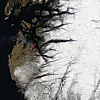 Vannet i fjorden til høyre er full av avleiringspartikler, sedimenter, fra snøsmeltingen. Bildet fra Lyngen i Troms er tatt i synlig lys. (Foto: Sentinel-2A, Copernicus, ESA/Andreas Kääb, Universitetet i Oslo)