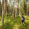 Forskere på vei inn i til forsøksfeltene for å sanke og registrere tyttebær. (Foto/CC: Mathias Amundsen)