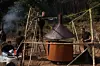 Her måler de røykutslipp fra en ny produksjonsmetode av biokull. Til venstre: ph.d.-kandidat Naba Raj Pandit, på stigen: hovedveileder, professor II Gerard Cornelissen, til høyre: hovedutvikler av metoden, Hans Peter Schmidt. (Foto: NMBU)
