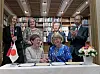 Rektor ved Sokendai, Mariko Hasegawa (foran t.v.) og UiT-rektor Anne Husebekk under signeringen av den nye avtalen. Bak står minister for forskning og høyere utdanning, Iselin Nybø (t.v.), Norges ambassadør til Japan, Inga M.W. Nyhamar, direktør ved det japanske polarinstituttet, Takuji Nakamura og direktør ved Sokendai, Takashi Nagata.